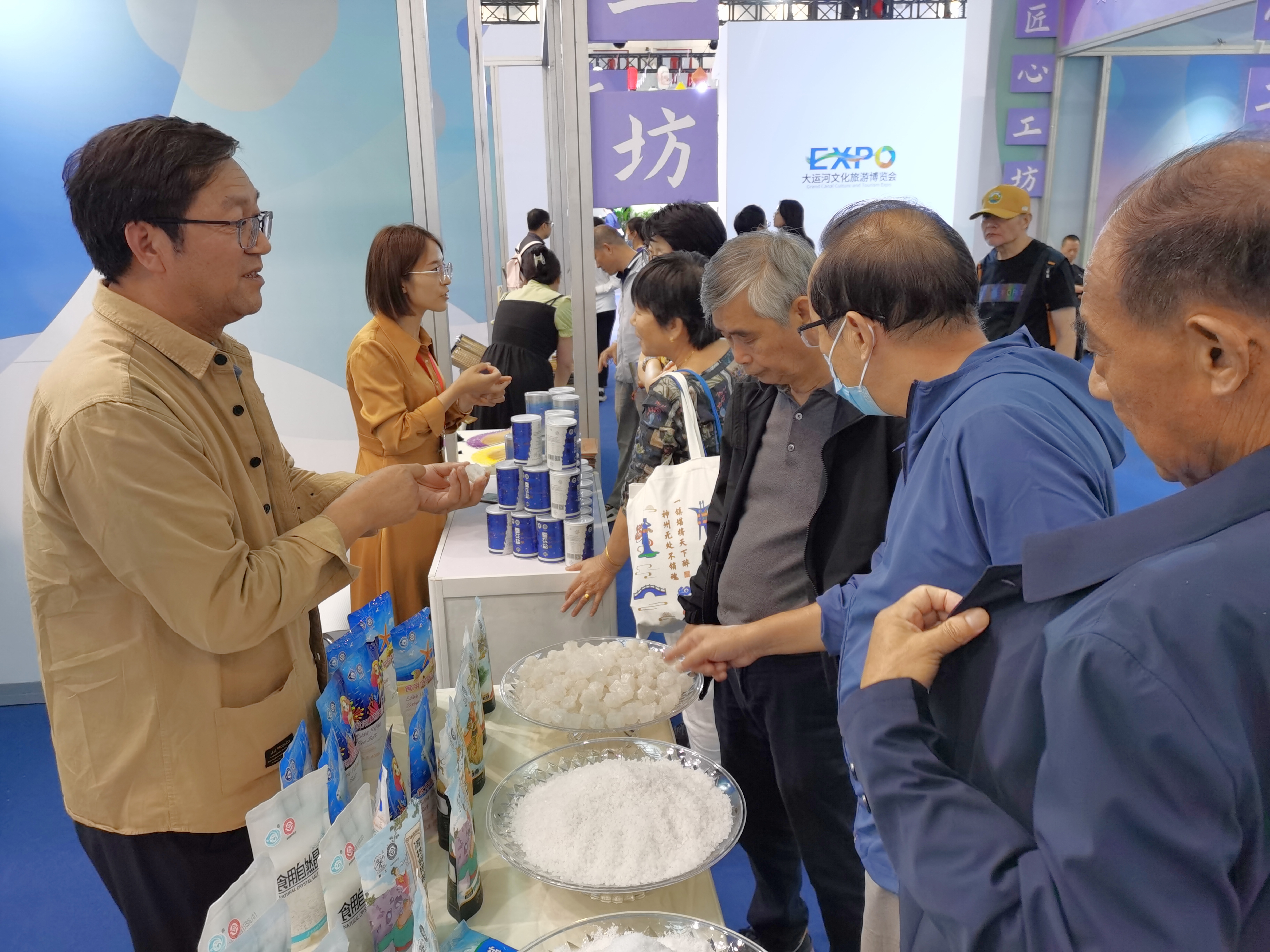 9月21日至24日,江蘇省委宣傳部和江蘇省文化和旅游廳等共同主辦的第五屆大運河文化旅游博覽會在蘇州工業園區舉辦,集團公司的國家級非遺項目“淮鹽制作技藝”受邀參展。這次共展示了加碘精制鹽、顆粒鹽、雪花鹽、低鈉鹽等“古淮”“猴王”品牌的20余個食鹽品種。