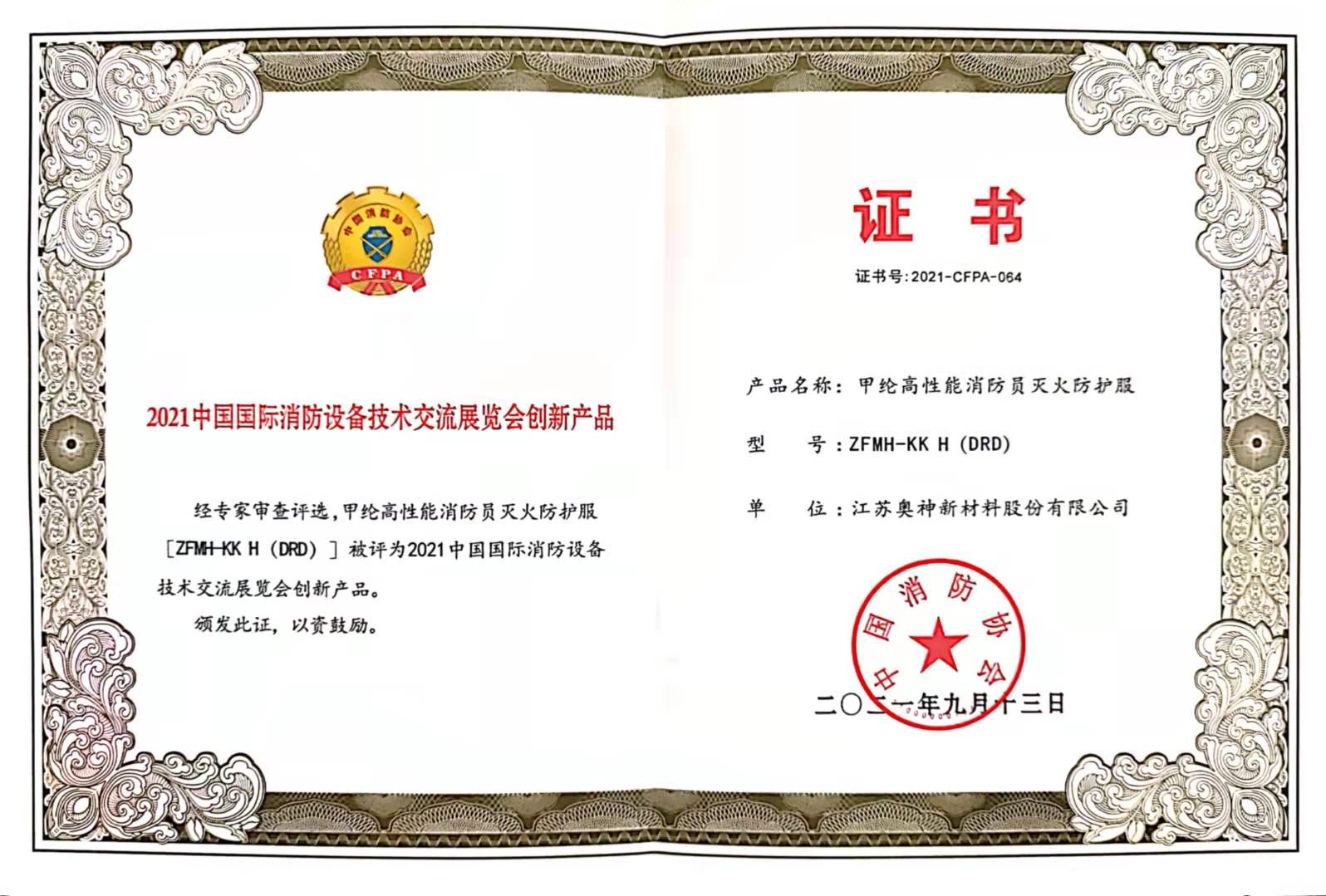 2021年1012日,在北京召開的第十九屆中國國際消防設備技術交流展覽會上,江蘇奧神新材料股份有限公司研發的“甲綸高性能消防員滅火防護服”憑借優異的性能獲得“2021中國國際消防設備技術交流展覽會創新產品”榮譽稱號。此次參與評選的都是來自全國各地實力雄厚的消防領域企業,經歷層層評選,甲綸高性能消防員滅火防護服脫穎而出,受到專家的一致好評。