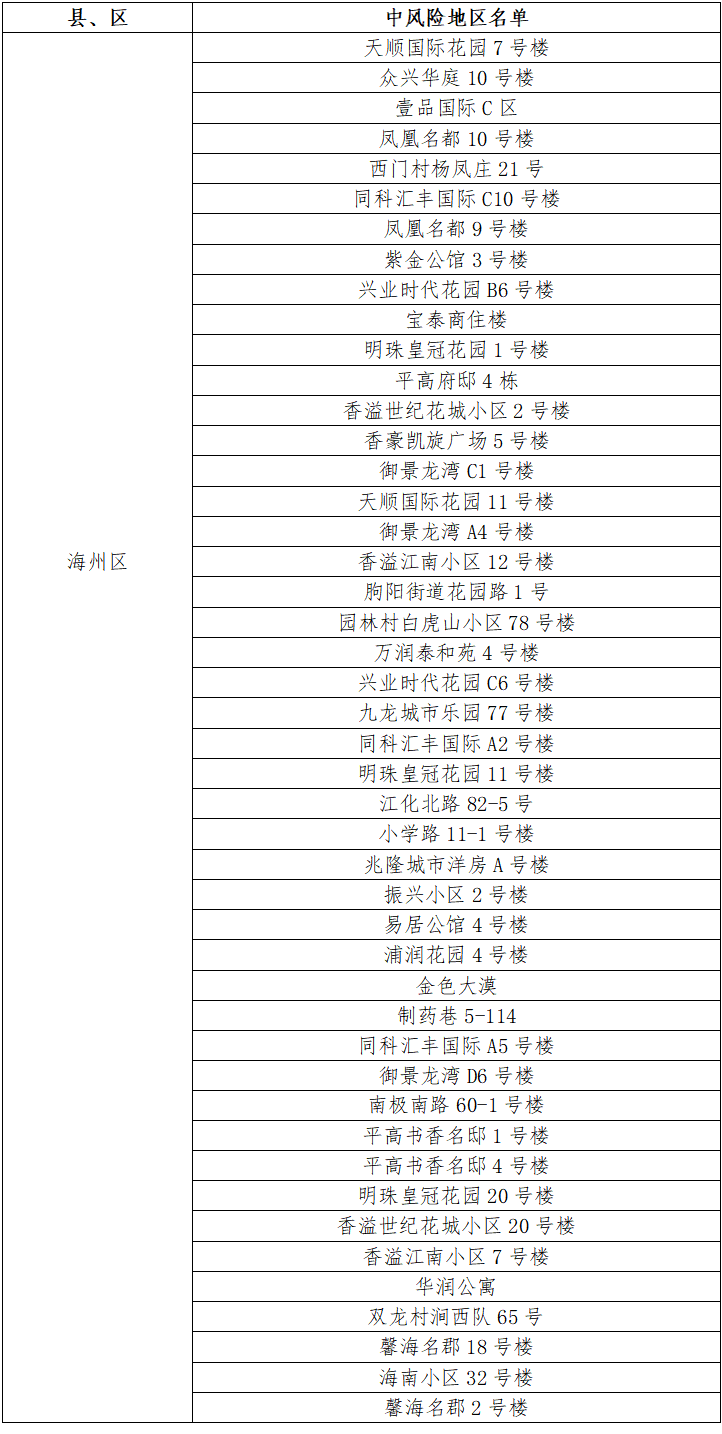 根據國務院聯防聯控機制有關規定,經市指揮部研究決定,自發布之日起,對我市部分區域疫情風險等級進行調整:海州區中央華府D1棟、玉蘭國際5號樓、福園名邸3號樓、一品苑44號樓、博威江南明珠苑33號樓、如佳賓館(霞輝路店)、鳳祥銘居7號樓、蒼梧春曉23號樓、龍河小區25號樓、鷹游水岸花園5號樓、海南小區34號樓、仕方國際9號樓、茗馨花園18號樓、梧桐藍山晴園7號樓、富強路疏導點旁三合院、百達菲力酒吧、通灌南路66號3棟、極美公寓4號樓、路南街道河運路35號樓、海連中路151號、興城四號公寓8號樓、青年路55號5棟、東方領秀7號樓、寶翔財富廣場3號樓、園林村白虎山組王莊隊13號、津華苑小區A2號樓、盛世豪庭小區8號樓、許莊村楊圩北隊51號、振興公寓6號樓、建欣路1號樓、園林村白虎山小區100號、路南街道東村巷2號樓、建設中路76-24號由中風險地區調整為低風險地區。
