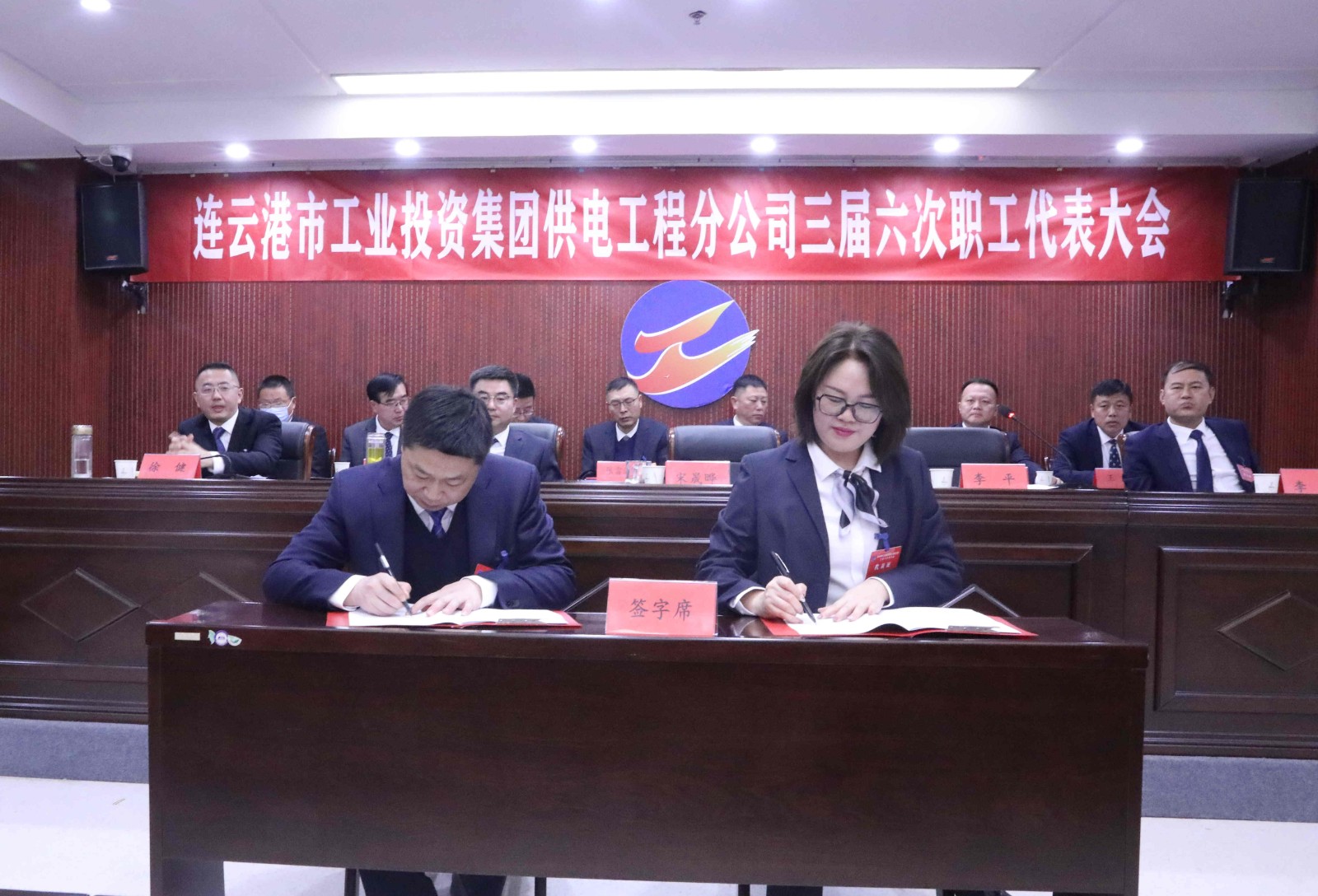會上對2022年度先進單位、個人進行了表彰,臺北供電所、徐南供電所、灌西供電所、安全管理部等四家單位、部門作了表態發言并簽訂了《2023年度集體合同》《2023年度經營目標責任書》。