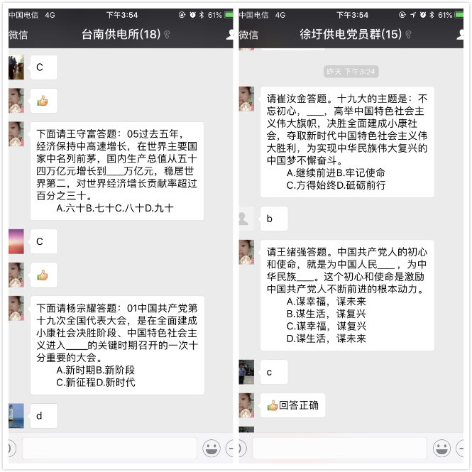 本次考試采用微信答題的方式,由黨群人員先在微信群里清點黨員人數,隨后每人回答指定問題,確保測試范圍覆蓋全體黨員。微信考試的方式,解決了黨員學習時間上、空間上的難題,具有很大的便利性和可操作性。(電宣)