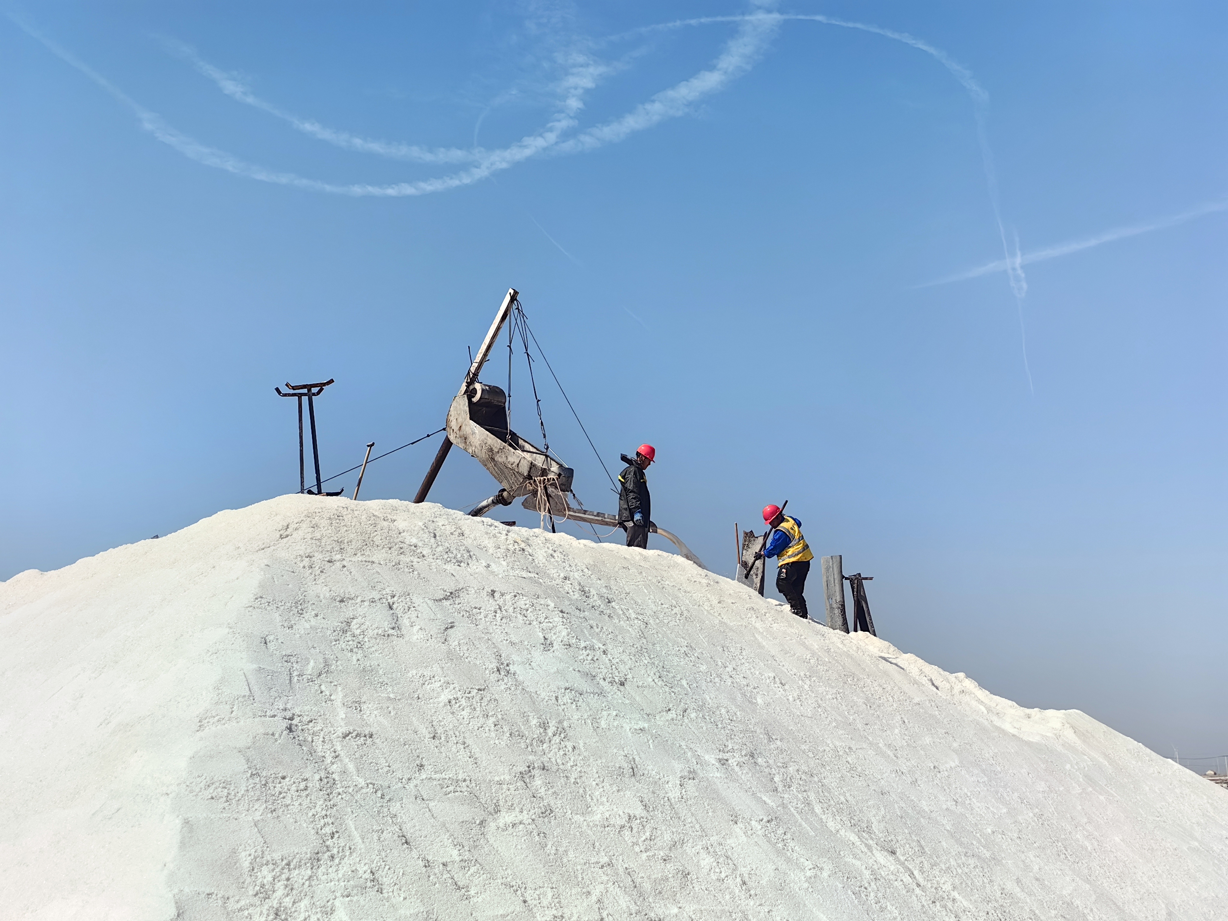 在八班扒鹽現場,一臺唐三零扒鹽機正在鹽池里進行扒鹽作業,唐三零操作手駕駛著機械,在鹽田中央緩緩行進著,不時的回頭觀察鹽泵吸鹽情況,確保扒鹽管道順暢。遠處的廩基內,大廩工正在熟練地利用分流板對鹽篩中傾瀉下的原鹽進行引導分流,熟練地打好廩墻。