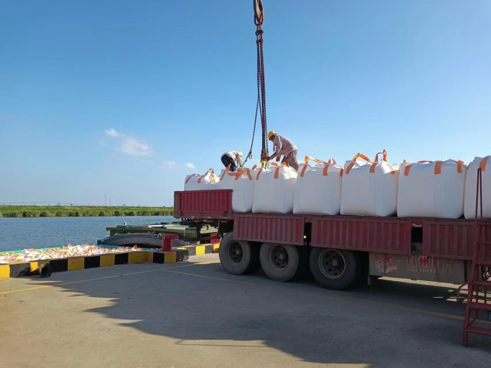 在火辣辣的太陽無情地照射下,一群勤勞的碼頭工人們正在調度著車輛和船只的進出,確保噸袋運輸過程的順暢無阻。另外幾個工人正操縱著高大的吊,他們小心翼翼地裝卸著貨物,每一個動作都顯得格外謹慎。整個碼頭被一種熱烈而緊張的“高溫”氛圍所籠罩,仿佛連空氣都因為這份熱情而變得灼熱起來。