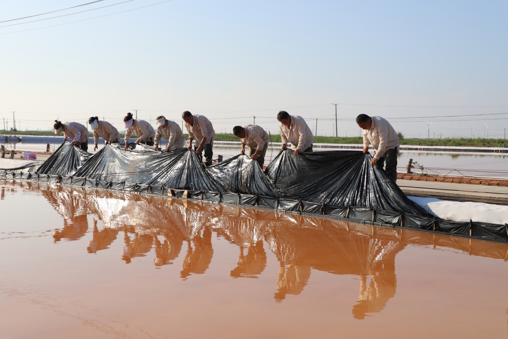 在破曉時分,日曬制鹽的萬畝鹽田被一輪旭日染上了一層金色的光輝,仿佛一夜之間,這片鹽堿地被冰封的魔力所籠罩,呈現出一種寧靜而又深邃的景象。凌晨4點半,那些勤勞的鹽灘工人早已熱火朝天地忙著活碴、修補塑布、加固浮板等保鹽保鹵工作。省勞模祝星星在巡灘時說道:“現在正處梅雨季節,我們戰高溫、搶天,在做好原鹽生產的基礎上,更要統籌做好抗災工程,確保安穩度汛。當然,我們對今年超額完成生產指標任務充滿信心。”這番話無疑是對他們辛勤勞作的一種樂觀詮釋。