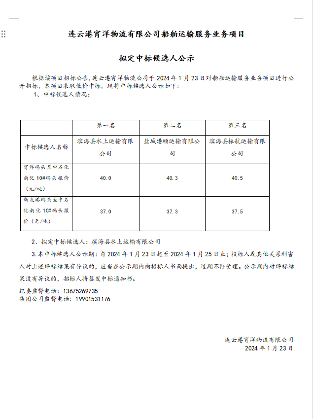 連云港宵洋物流有限公司船舶運輸服務業務項目擬定中標候選人公示