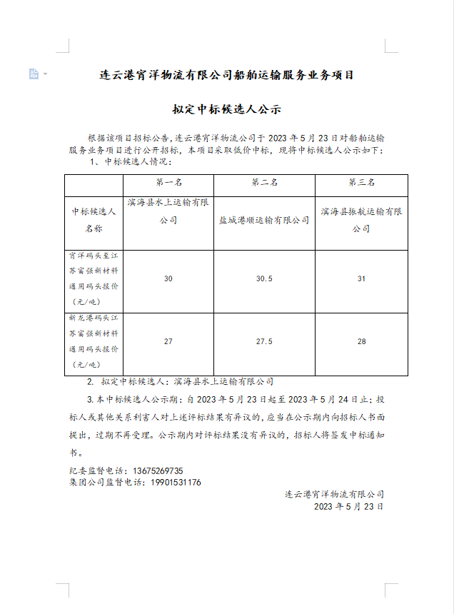 連云港宵洋物流有限公司船舶運輸服務業務項目擬定中標候選人公示
