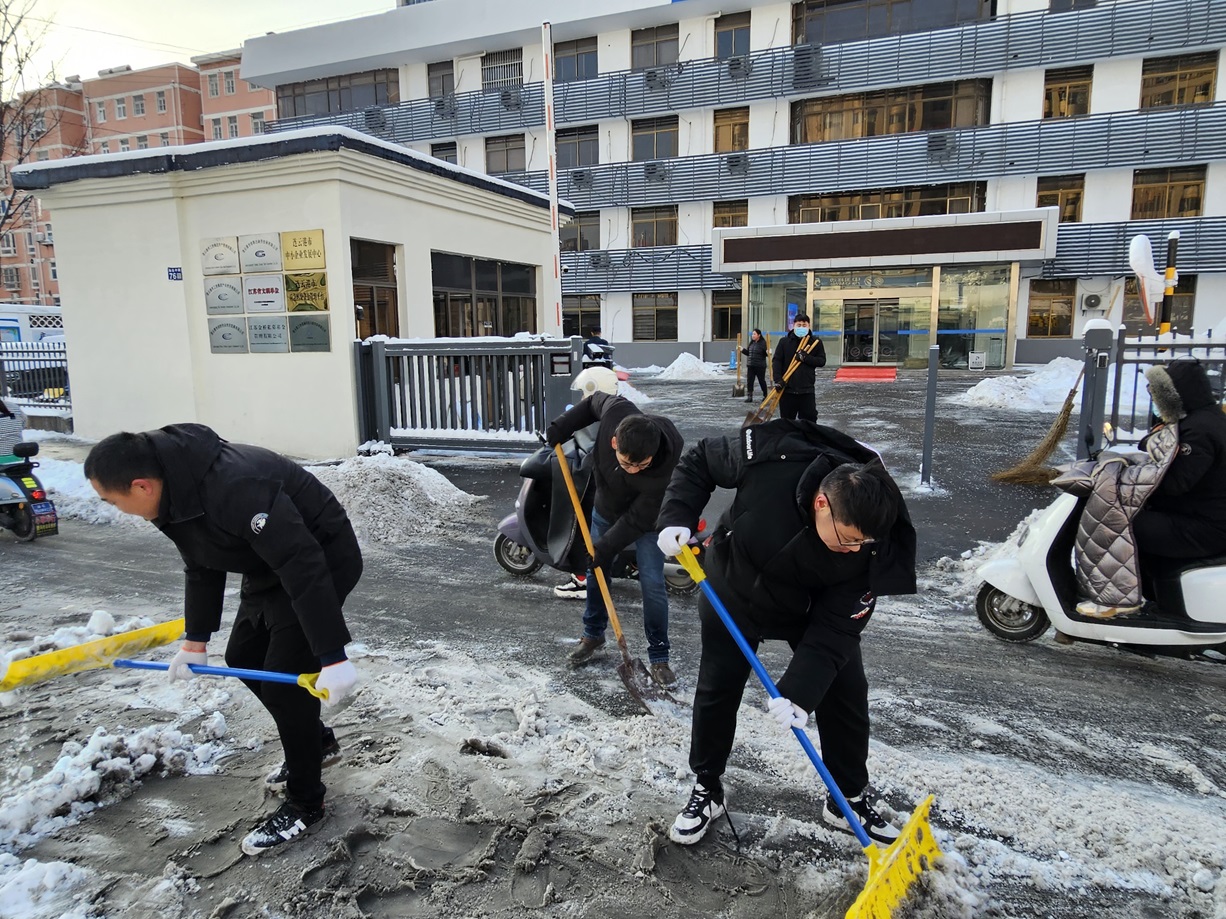 昨日,暴雪如期席卷我市,銀裝素裹間,積雪厚度迅速增加。公司門前及院內的厚重積雪,日常辦公與員工的出行安全埋下了不小的隱患。面對這一情況,金融板塊的員工們迅速響應,以雪為令,迎寒而上,展開了一場掃雪除冰的集體行動。