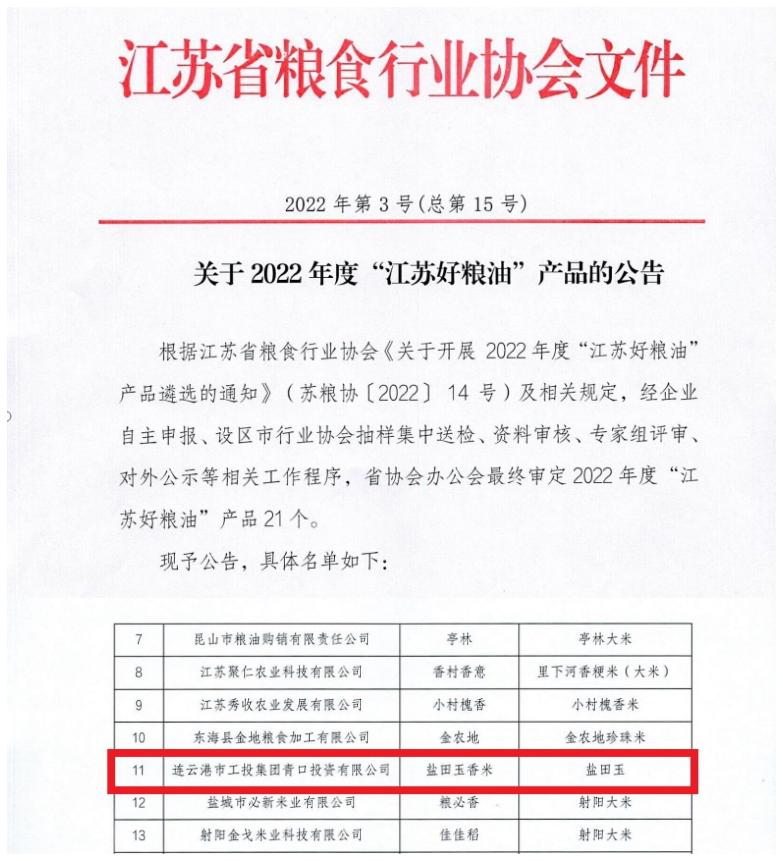 日前,江蘇省糧食行業協會發布2022年度“江蘇好糧油”產品名單,由我公司生產的鹽田玉香米成功入選。