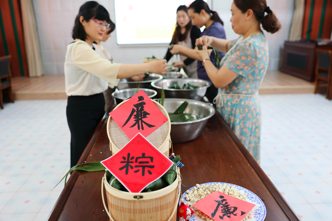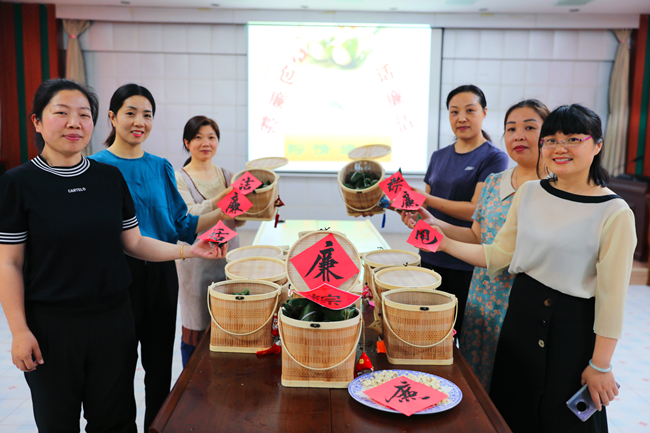 在活動現場,桌子上擺滿了碧青粽葉、黑白糯米、紅豆大棗、白色蓮子,烘托出濃厚的節日氣氛。大家歡聚一堂、歡聲笑語,在傳統文化中感受廉潔元素,一邊聊著家常,一邊包著粽子,先是選好“青”廉衣,然后放入提前泡好的 “蓮”心餡,最后系緊“廉潔繩”,不一會,一個個碧綠飄香、形狀各異“廉心粽”就包好了,被整齊地擺放在竹籃中。紀委書記朱文兵說:“廉心粽蘊含著清正廉潔的美好寓意,組織大家親手包廉粽,是希望大家能夠把‘廉’帶回家,在品嘗美味廉粽的同時,還要時刻繃緊廉潔弦,做到守廉潔、過廉節”。