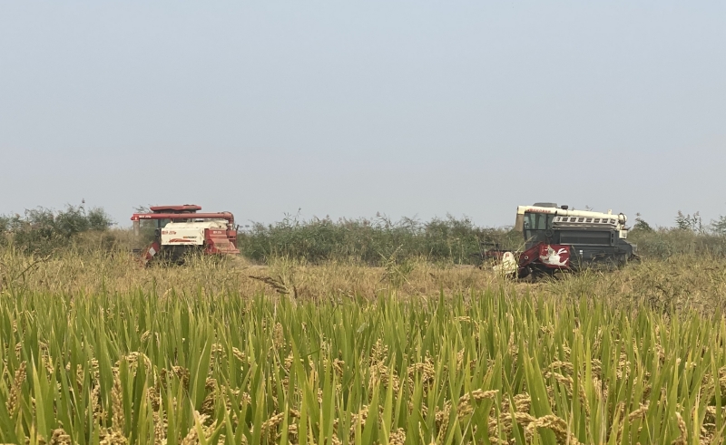 ? ? ? ?10月13日,大新農場50余畝稻花香水稻迎來成熟期,開鐮收割。在金色的稻田里,稻谷隨著秋風翻起波浪,空氣中裹挾著稻米的清香。轟隆隆的收割機來回穿梭在稻田之中“作畫”,眼前呈現出一派秋收的忙碌景象。(王璐)
