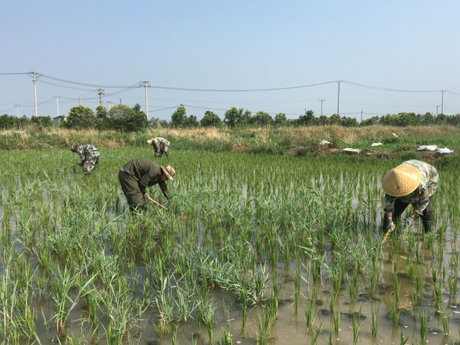 盛夏時節,正是水稻生長關鍵期,生態種養中心的職工在烈日下手工拔除水稻間的雜草。為確保稻米的品質,中心堅持利用人工除草作業,減少化學農藥的使用。 (莫宗剛)