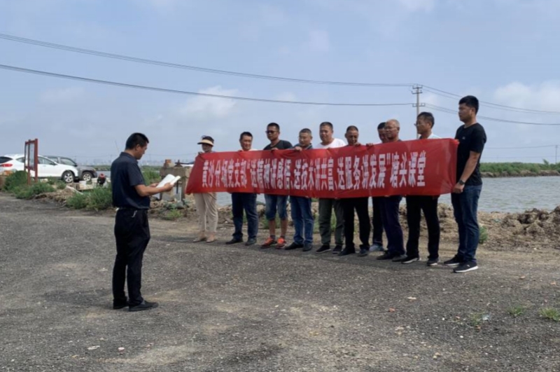 近日,黃沙分場黨支部開展“送精神講感悟、送技術講共富、送服務講發展”塘頭課堂。黨員、養殖戶齊聚塘頭,深入學習黨的二十大精神,結合中秋、國慶“雙節”,共同探討交流水產品銷售行情,提升養殖整體效益。(盧伯斌)