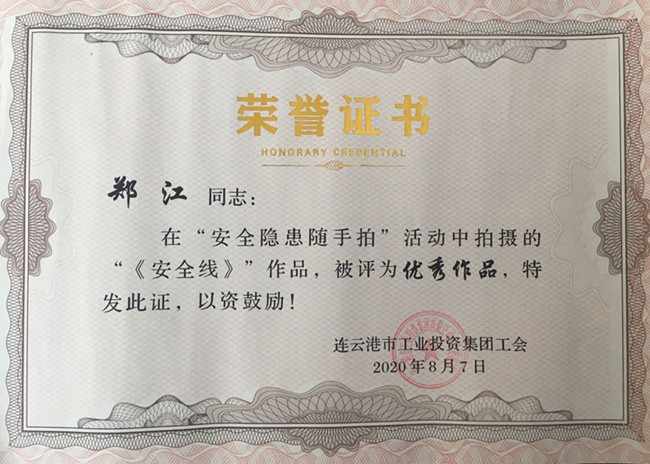 ? 集團公司工會5月以來開展了“安全隱患隨手拍,合保安康你我他”為主題的“安全隱患隨手拍”活動,青口工會廣泛宣傳,組織廣大職工積極參與,期間共收到職工“隨手拍”作品近二十件,并上報集團公司參加比賽,經上級專家評審,我公司工會被評為“先進集體”,鄭江作品《安全線》獲得優秀作品獎。