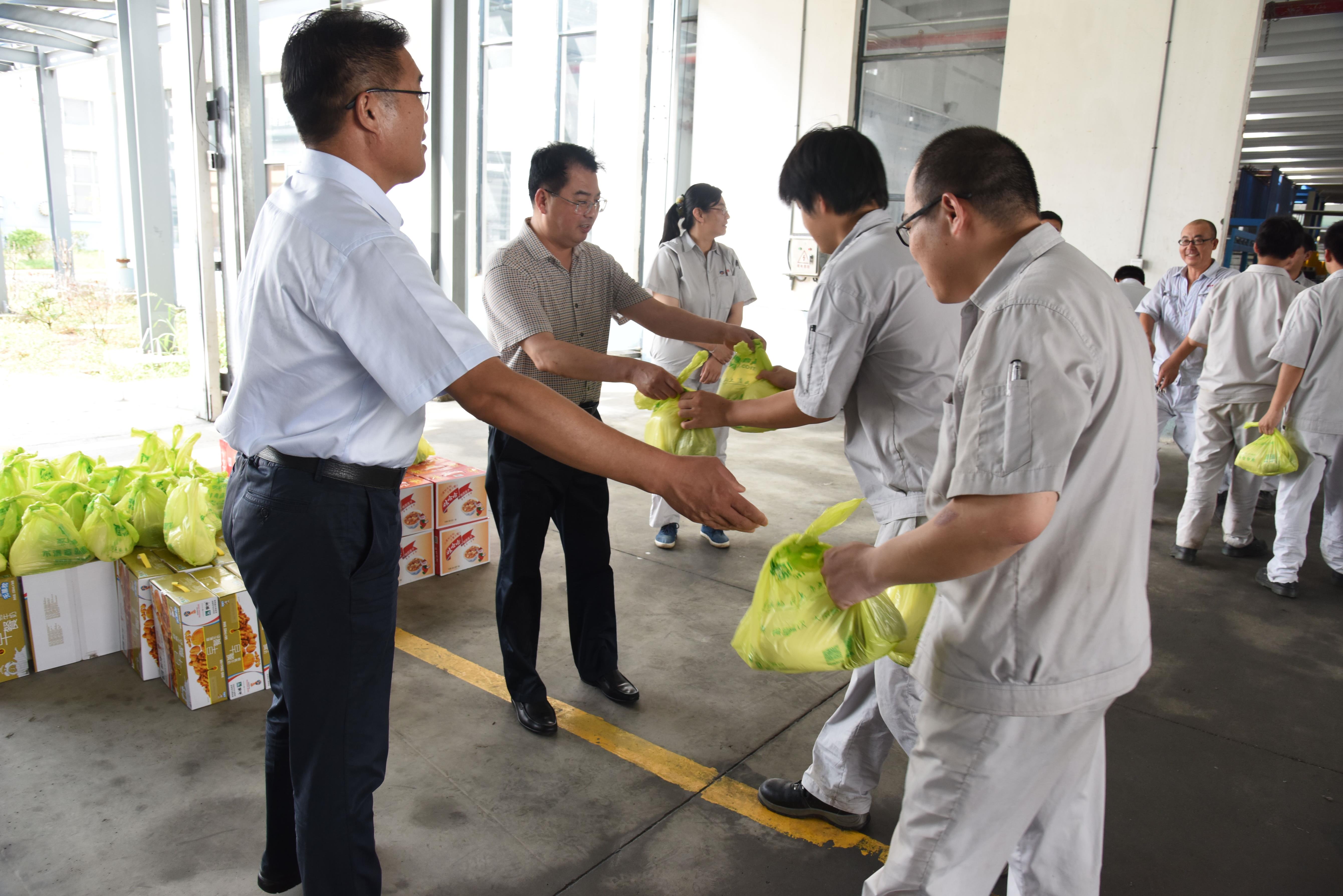 7月19日下午,集團公司黨委副書記戴鴻鳴、工會主席劉承志一行不顧酷暑高溫,深入到神特公司生產一線,為職工送上了牛奶、綠豆等防暑降溫物品。戴鴻鳴書記詳細詢問了生產經營管理及職工的生產、生活等情況;同時督促神特公司要進一步落實防暑降溫政策,切實維護職工的健康權益。