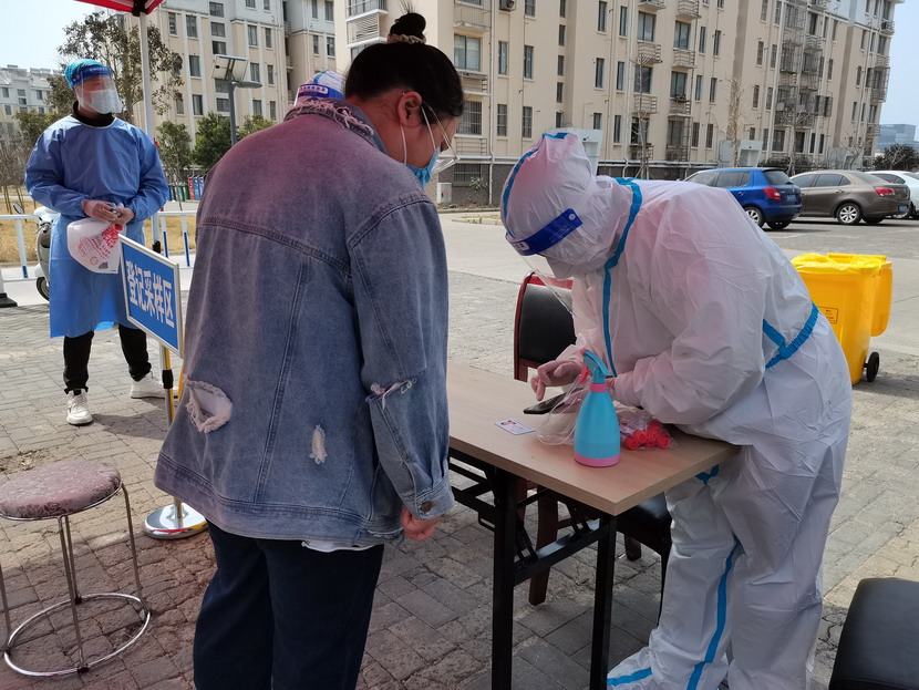 清晨6點30分,1號檢測點,李明同志在檢查物資,“大白”服裝4套、“小藍”服裝6套、棉簽600根……;2號檢測點,于洪亮在將物資上桌,病毒核酸檢測試管、棉簽、消毒液,“還缺少一瓶酒精,我立即反饋給社區,請社區抓緊安排送來”;4號檢測點,蘇玲、秦黎明正在互相幫忙穿好防護服,“秦姐,這個防護面罩里外有兩層薄膜,我給你撕掉,這樣就不會有霧氣了”,“嗯嗯,你這個拉鏈得拉到頂,我們自己也一定要做好防護”秦黎明溫柔的說;5號檢測點,內退黨員孫芳和姜海洋,互相在防護服后背寫上對方的名字,以便于更高效的完成檢測工作;6號檢測點,霍正鋼、朱文健、韓永剛、邱榮濱正在清點檢測小卡片;7號檢測點,張強在拿著酒精給廢物處置垃圾箱消毒;8號檢測點,新加入的孫銀、占恒春、尹永明、韓永光、趙紹慶正在給消殺噴霧劑灌裝84消毒液,社區8個檢測點的消殺工作全部由昌圩臨時黨支部志愿者負責。