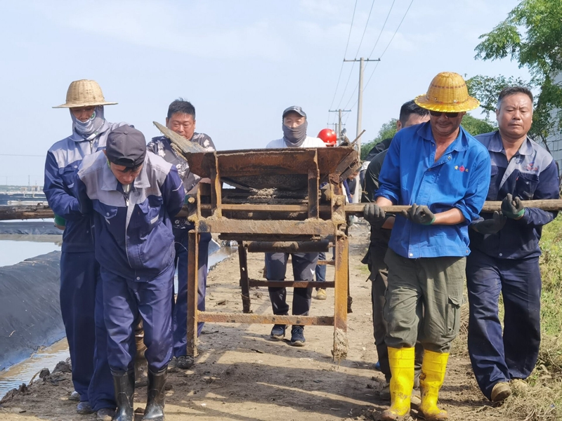 養殖池邊,工作人員仔細的對河道清淤進行現場勘查,確保排水通暢。