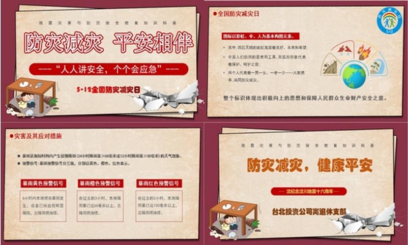 近日,離退休支部開展5·12防災減災”科普活動。結合支部的實際情況,通過辦公場所用電防火安全檢查和交通出行安全警示,進一步排查整改生活、工作中存在的安全隱患。組織觀看防災減災宣傳片和制作防災減災PPT來普及防災減災知識,了解地震、臺風、暴雨、洪水等自然災害的應對措施,來防范化解災害風險,提升公眾防災減災的意識和能力,實現“人人講安全,個個會應急”。