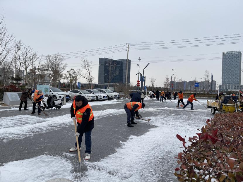 ? ? “風雪無情 志愿有愛”?;顒又?,大家不顧凜冽寒風,積極除雪、干勁十足,有的用鐵鍬鏟除冰塊,有的用掃帚清掃積雪。鐵鏟、掃帚與地面的摩擦聲此起彼伏,譜寫了悅耳動聽的清脆樂曲。志愿者一鐵鍬、一笤帚將積雪推至路邊,經過連續奮戰,園區內路面積雪得到及時清理,通行逐漸恢復順暢。