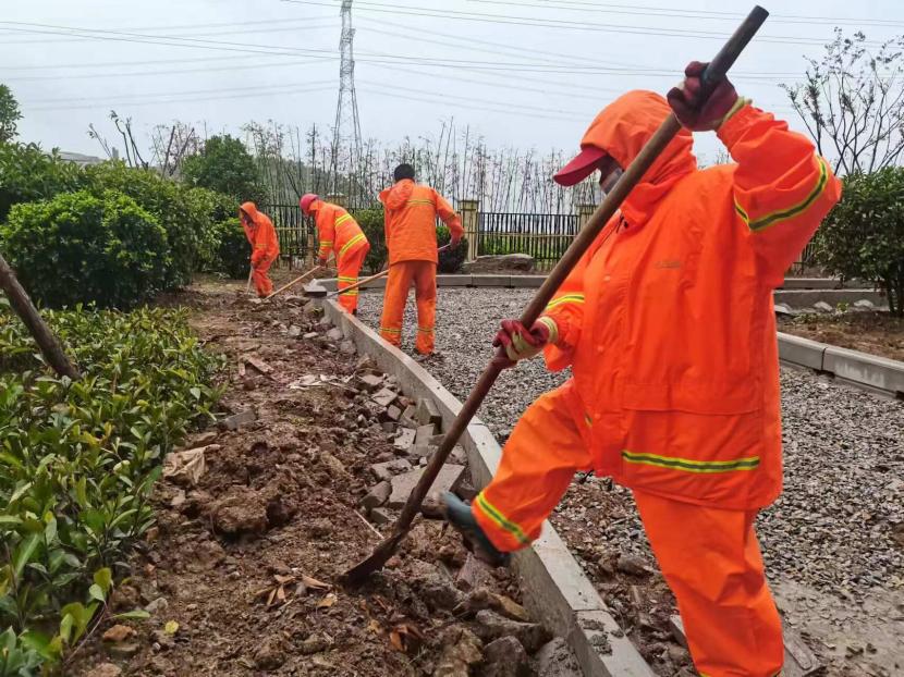 綠化工人無暇顧及這傾盆大雨,他們頭戴草帽,身披雨衣,手中的工具一刻也未曾停歇。他們或是彎腰修剪著路邊瘋長的枝葉,或是蹲在地上清理著被雨水沖刷堆積的雜草。雨水順著他們的臉頰流下,模糊了他們的視線,但他們只是抬手隨意抹一把,便又繼續投入到工作中。那一雙雙粗糙的手,在風雨中熟練地操作著工具,仿佛在與大自然進行一場無聲的較量。