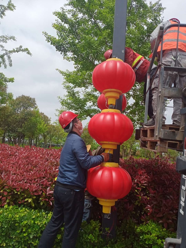 施工現場,大家配合默契利用小型叉車進行輔助拆除作業,五分鐘不用一個燈籠就拆除完成。這邊完成拆除部分,那邊負責還原以及運送回收。由于燈籠的不可收攏,同時為避免造成二次污染,對于拆下來的燈籠及時進行運送回收保存,確保第二年要安裝的時候重復利用。