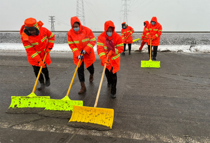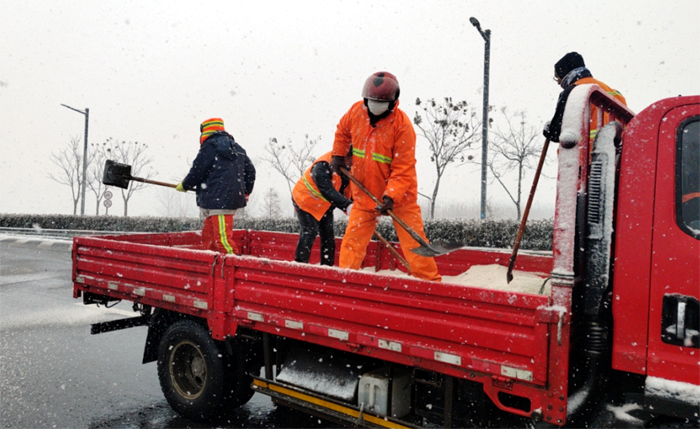 悅升公司按照責任分工,分包路段、分配任務,出動除雪機械設備,夜以繼日、奮戰一線,緊張有序地開展道路冰雪清除工作。本次出動保障人員160余名,兵分7路,2路裝卸隊負責將提前采購好的200多噸融雪劑有序裝車,5路道路保障隊負責各自區域內的冰雪清除。保障人員克服地面濕滑、氣溫驟降等不利因素,秉承“減存遏增”的理念,各路段按照人工+機械的方式,采取“邊下雪邊除雪”的工作模式,共出動2輛雪輥車、4輛大雪鏟車、1臺撒播機、運雪皮卡和廂貨車共11輛,循環開展除雪作業,各組之間配合默契,大大提高了工作效率。